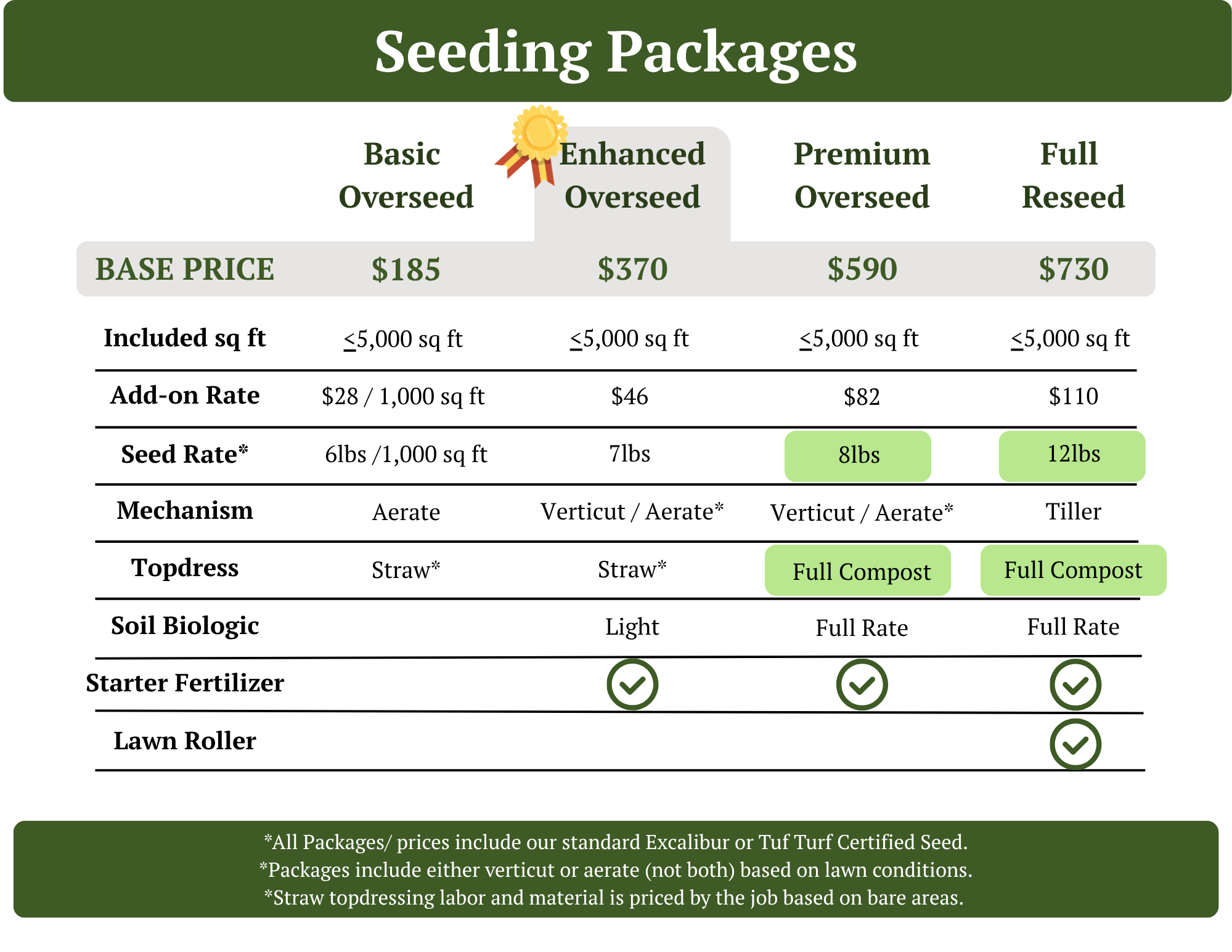 Our standard seeds reflected in the prices above are either Excalibur (100% tall fescue) or Tuf Turf (10% KBG, 90% tall fescue). Additional rates may apply for specialty blends (such as for heavy shade).